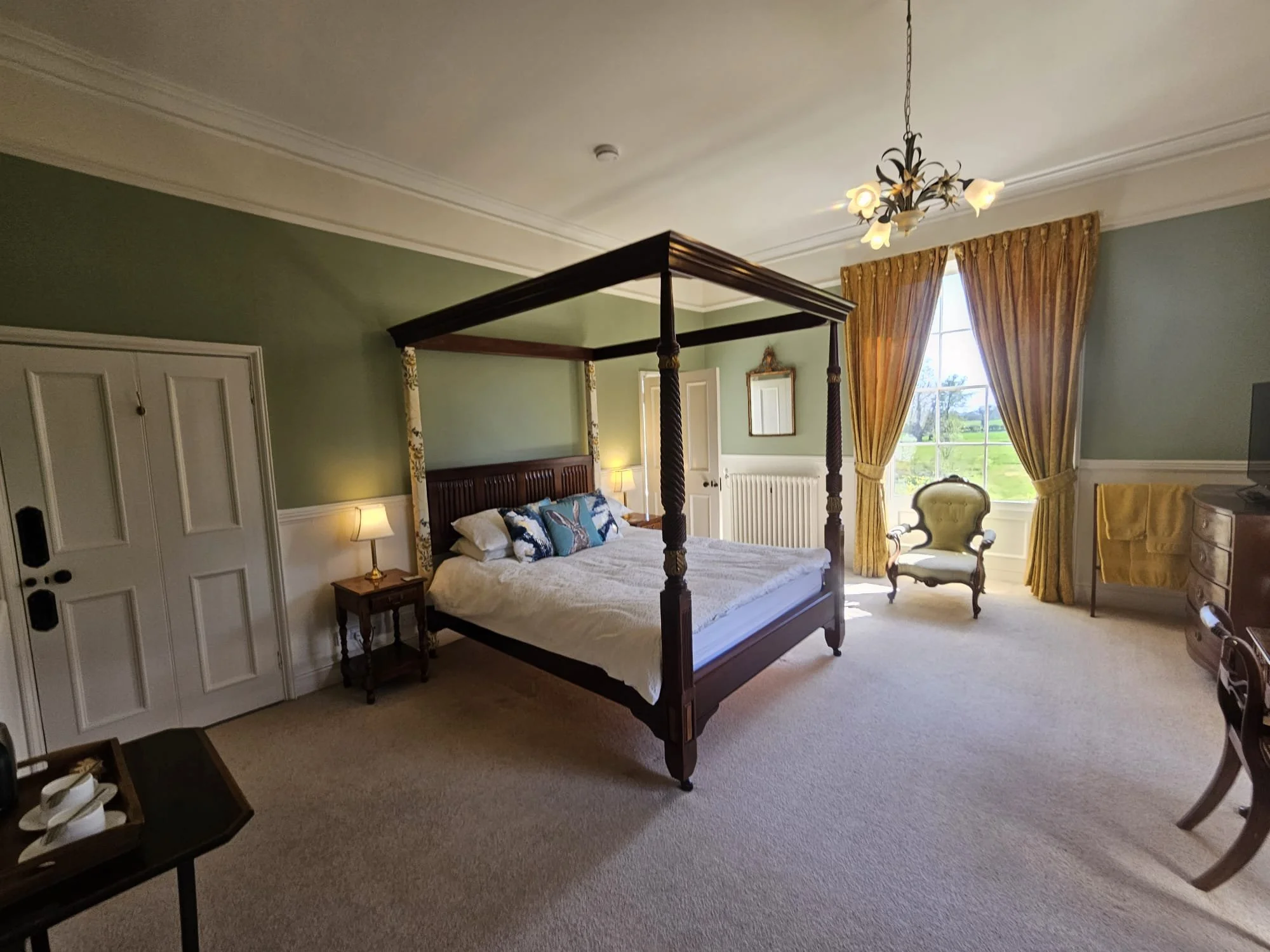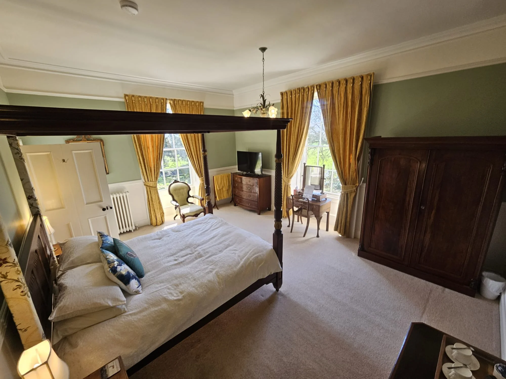 The Green Room with its double aspect views over the rear garden and park. The large elegant bedroom has a wonderful four-poster bed and period furniture giving it a luxurious feel for those wanting something extra special. The green room has its own en-suite bathroom with a shower over the bath.