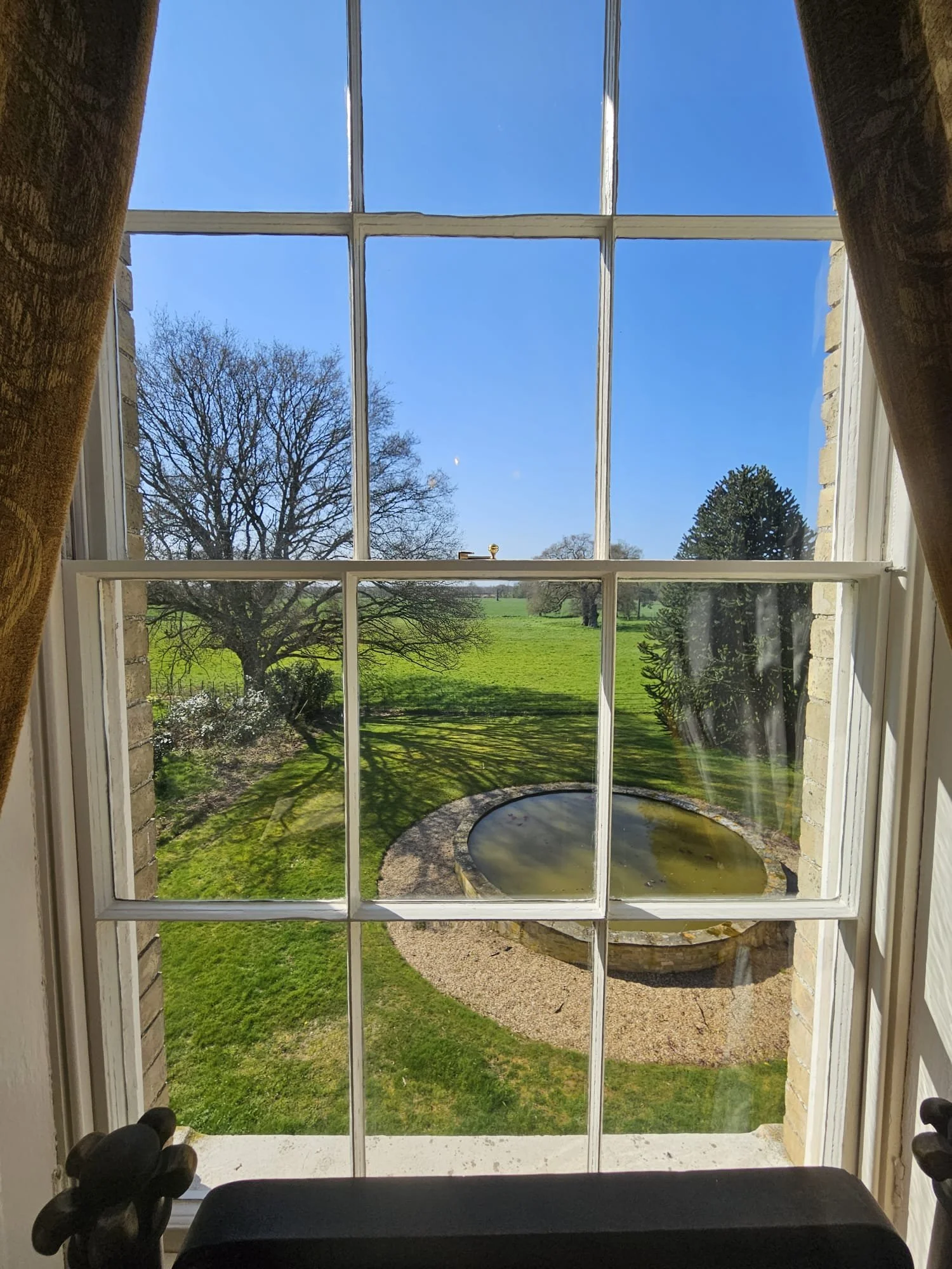 Originally the master bedroom, this gracious room is light and airy with double aspect windows facing south and west catching the sun for most of the day. The Blue Room is. a double room with a super kingsize sleigh bed. It is decorated in blue tones to compliment the period furniture. From the windows are beautiful views of the garden, ornamental pond, and the parkland beyond. The room has its own large private bathroom with a bath and shower directly across the hall purely for the use of guests in this room (note not en-suite).
